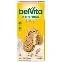 Bитаминизированное печенье "belVita Утреннее" в формате сэндвич с цельными злаками и йогуртовой начинкой обогащено кальцием и железом. Печенье злаковое - идеальный утренний ритуал: они дополняют йогурт, творог, каши, фрукты и делают завтрак еще вкуснее и питательнее. Утреннее печенье с начинкой является альтернативой круассанам, пряникам, сладким крекерам, кексам и другой выпечке; отлично подходит к чаю и к кофе, прекрасно сочетается с молоком, кефиром, ряженкой, соком, какао и другими напитками. Печенье в индивидуальной упаковке удобно взять с собой на работу или на прогулку, в поездку, на пикник или на дачу. Полезное печенье с йогуртовой начинкой belVita в составе сбалансированного перекуса – это то, что позволит зарядить бодростью и оптимизмом свой день. А ведь именно хорошее настроение – это залог успешного дня!