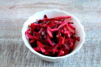 Свекла, морковь, яблоко,лук репчатый, огурцы соленые, салатная заправка.