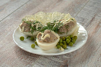 Отварить яйца, разрезать пополам . вынуть желток. Соединить жареную с луком печень с желтком и половинку белка начинить .Сверху украсить майонезом