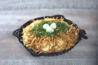 Филе куриной грудки запечь ,остудить, порезать соломкой. Яйцо отварить -порезать соломкой.Огурец помыть , порезать соломкой..Добавить майонез и все ингридиенты перемешать в глубокой посуде.Картофель очистить от кужуры , натереть на терке и обжарить во фритюре Сыр натереть на терке, смешать с майонезом -сформировать шарик в форме яйца. Разделить салат на порции, посыпать картофелем пай и посредине положить сырный шарик.