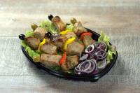 Свиная шейка, болгарский перец, репчатый лук, лимон, маслины, перец черный молотый, соль. 3 порции по 2 штуки.